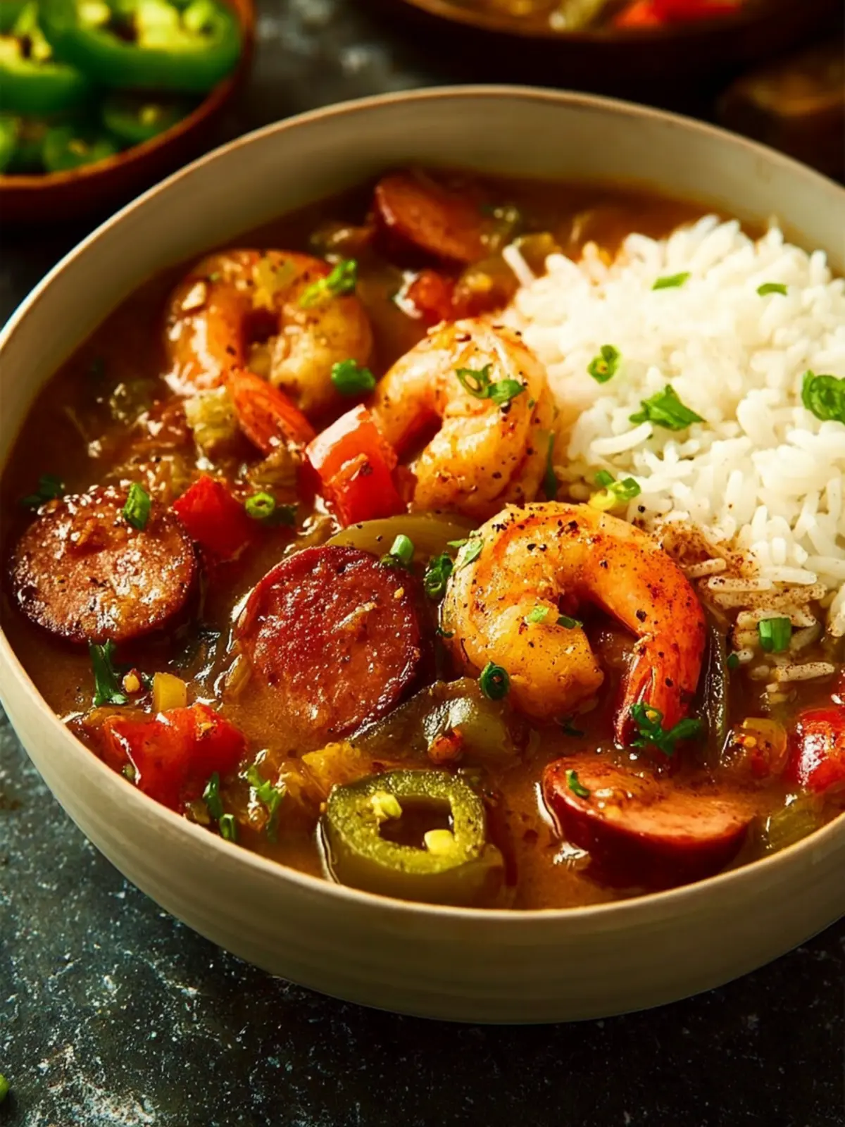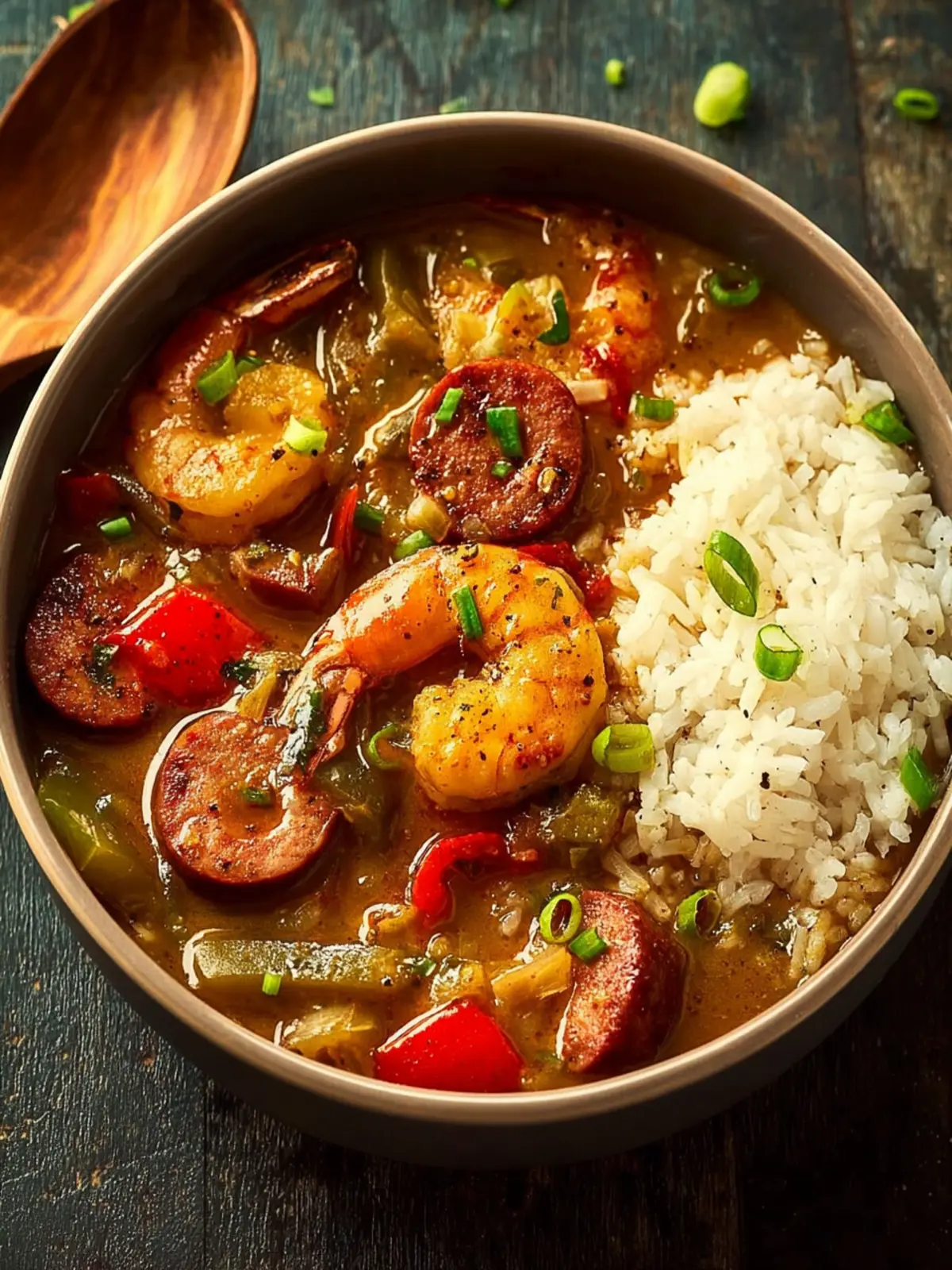 A flavorful Cajun seafood gumbo filled with shrimp, andouille sausage, and vegetables, served over rice.
