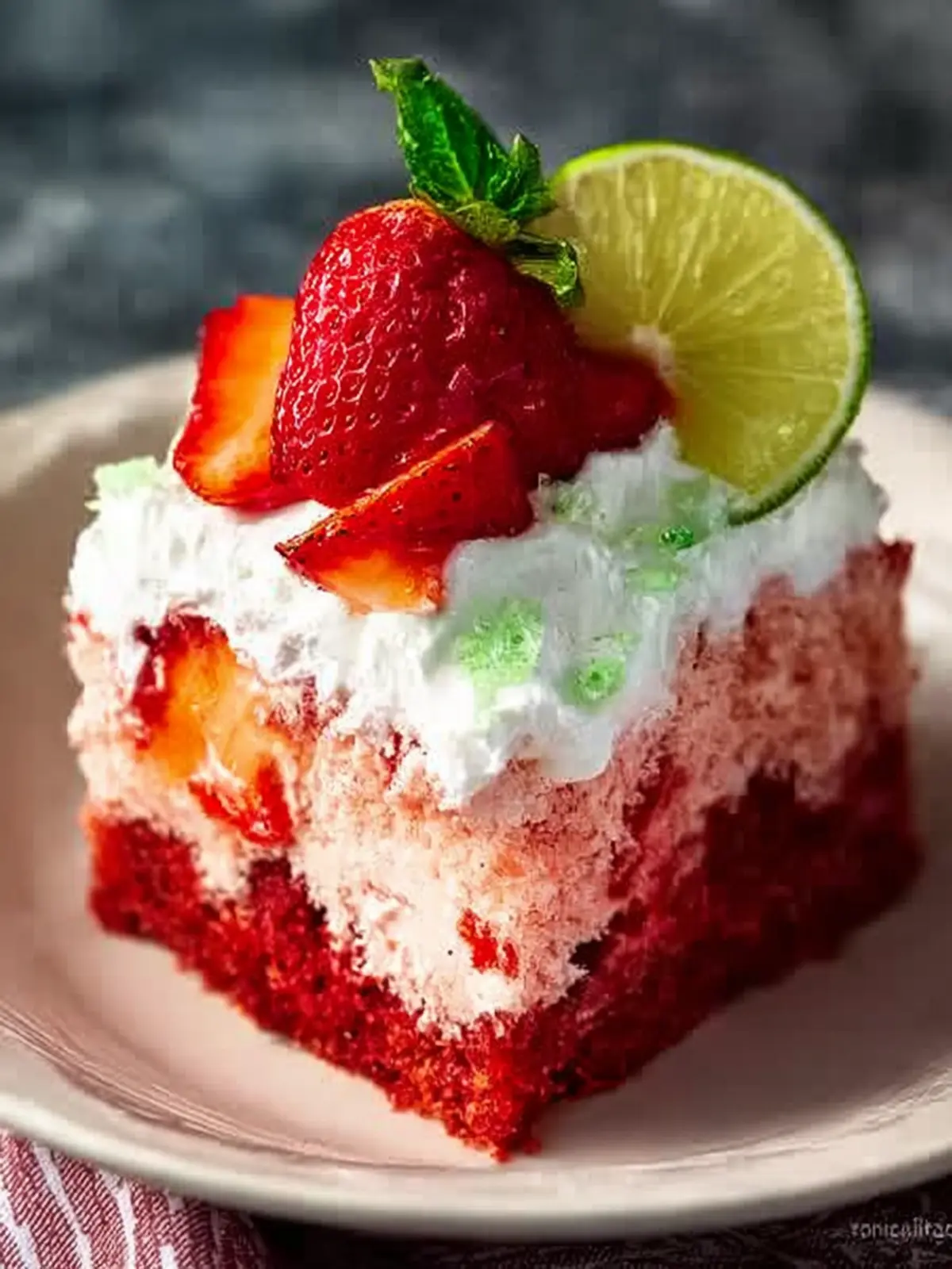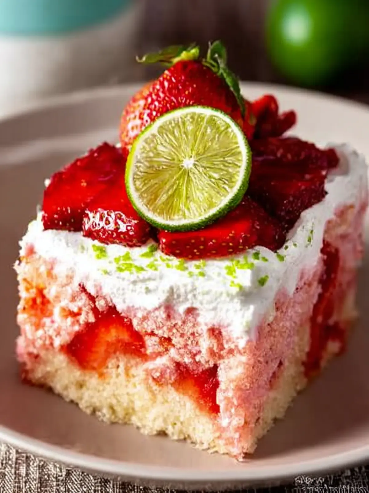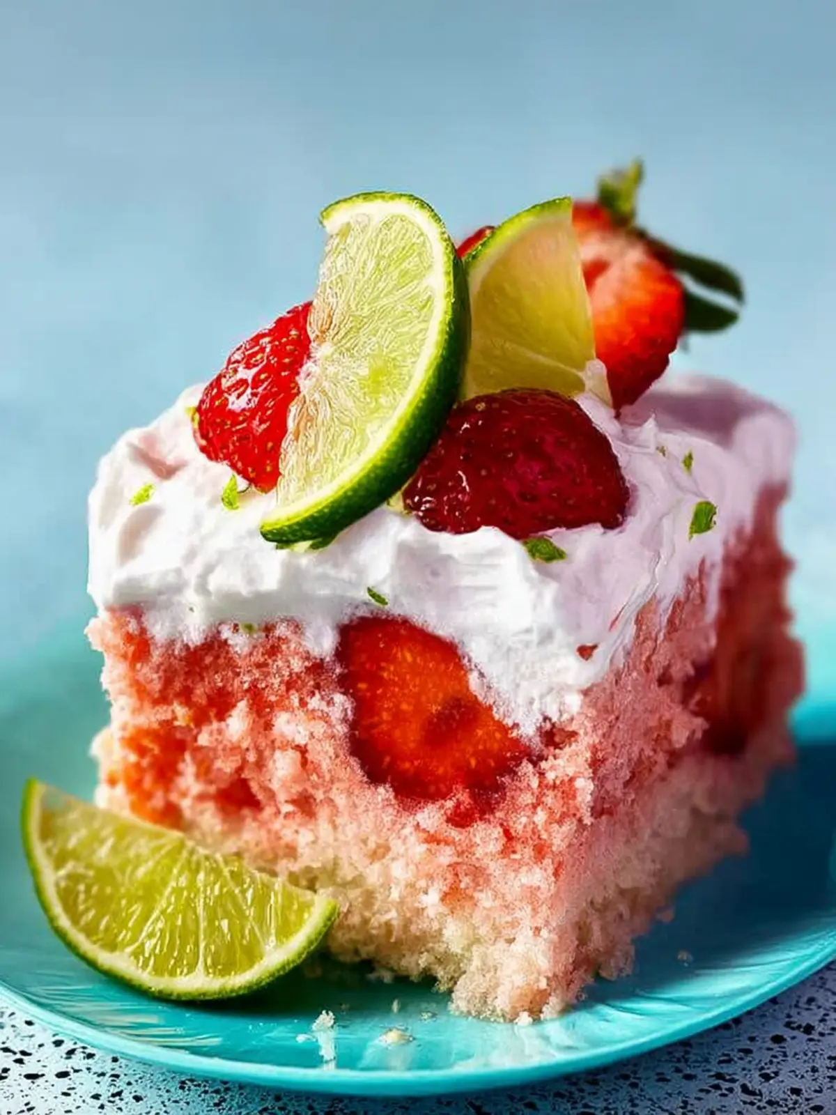 Fun Presentation: Topped with whipped cream and adorned with fresh strawberries and lime, the visual appeal is undeniable. Whether it’s a potluck or an intimate dinner, this cake will undoubtedly be the showstopper.