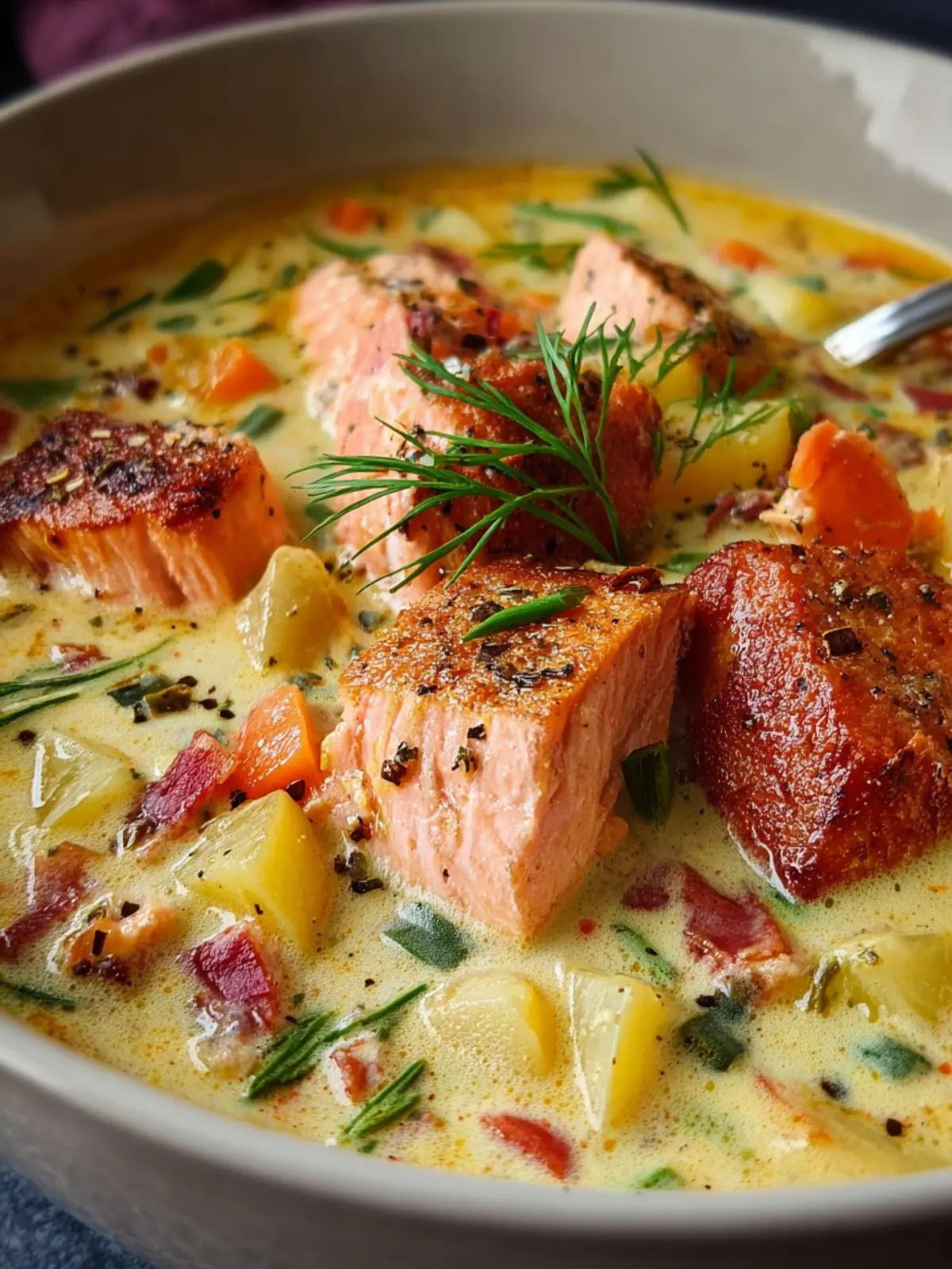 A creamy and delicious chowder featuring tender salmon, potatoes, and corn, garnished with fresh herbs.