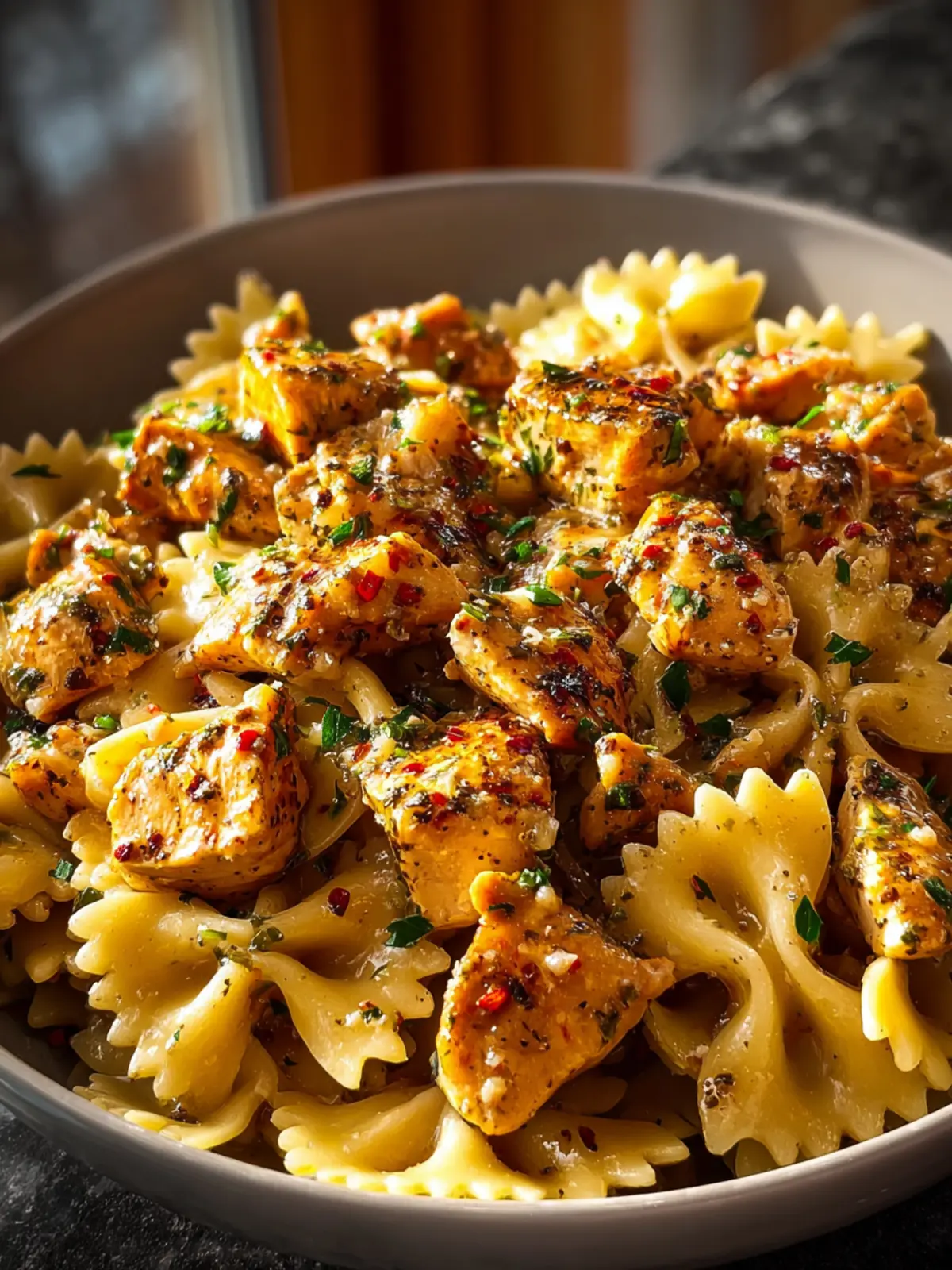 A delicious creamy garlic butter chicken pasta dish featuring tender pieces of chicken and bowtie pasta in a rich sauce.