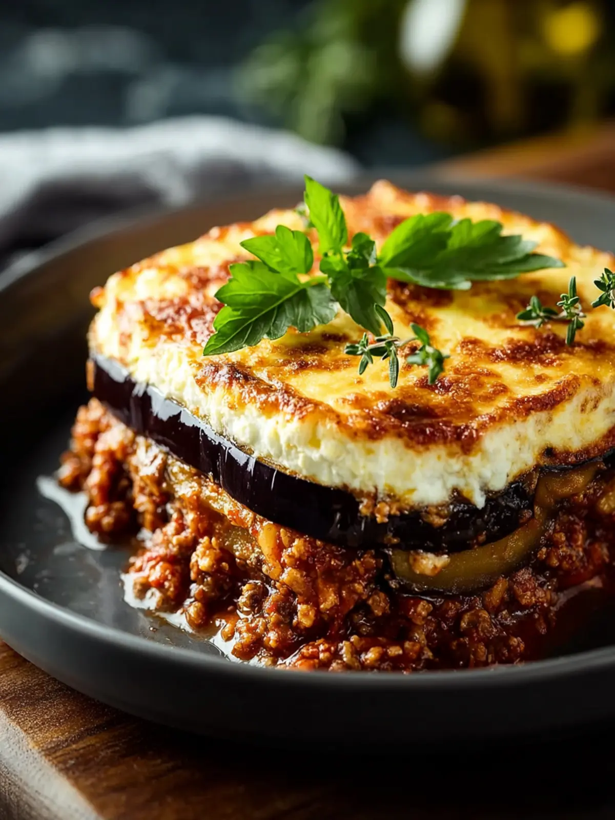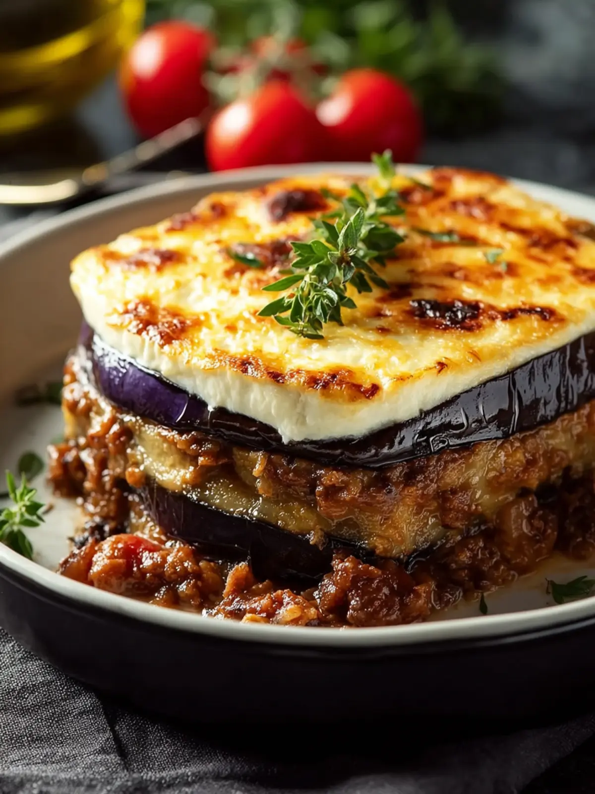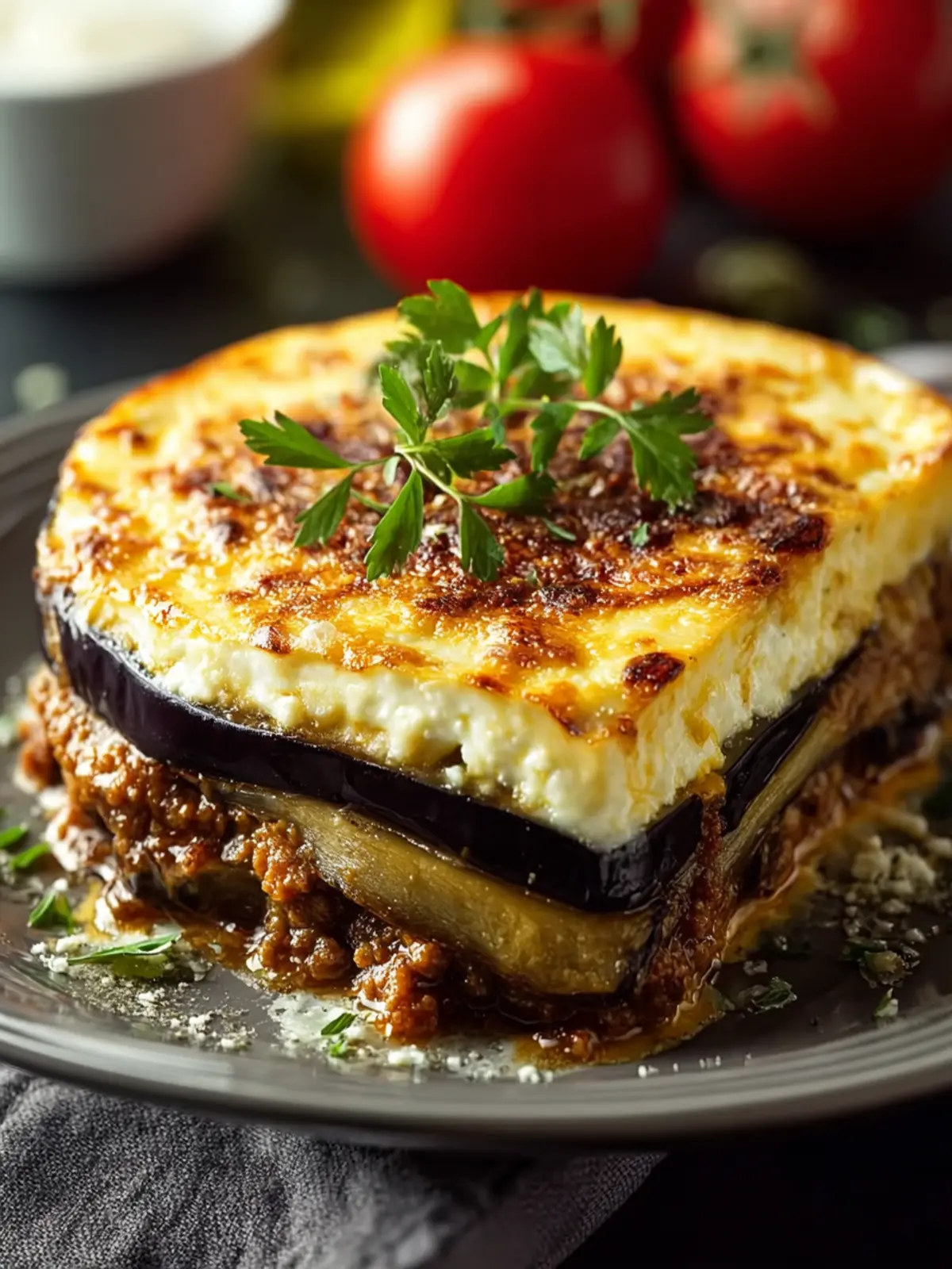 A classic Mediterranean dish made with layers of eggplant, seasoned meat, and béchamel sauce.