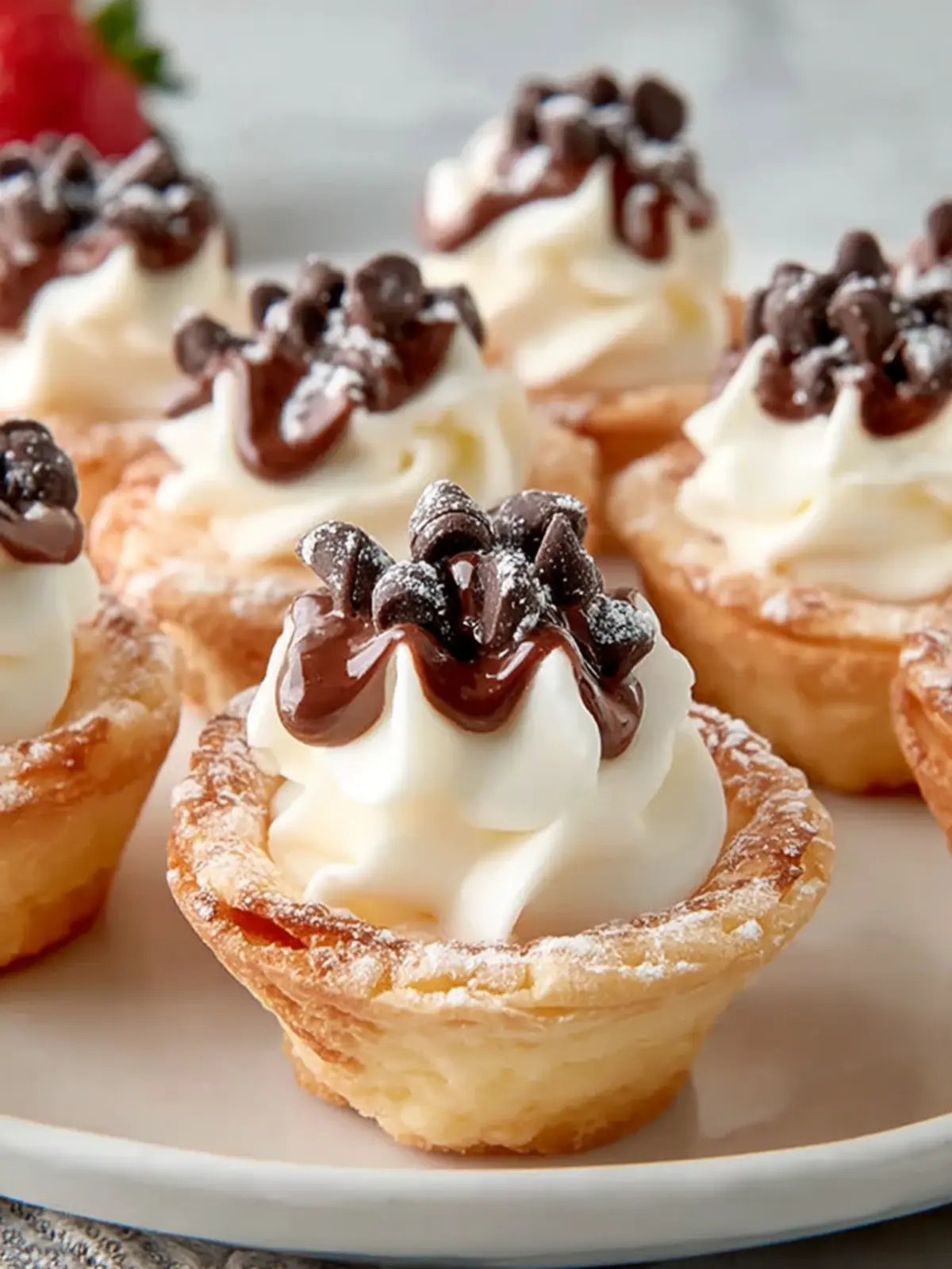 Delicious mini pastry shells filled with a creamy ricotta mixture, topped with chocolate chips and powdered sugar.