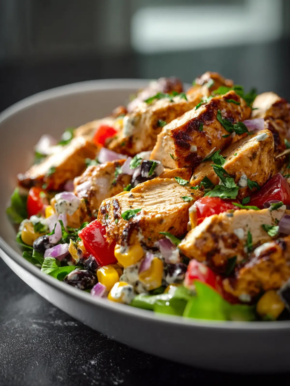 The Southwestern Chicken Salad stands out for so many reasons. First and foremost, it’s a visual delight. Picture freshly grilled chicken nestled atop a bed of crisp romaine lettuce, accompanied by a rainbow of ingredients that dance on the plate. We’re talking about juicy tomatoes, crunchy bell peppers, and zesty corn that create a medley of textures and flavors. And don’t forget the heartiness of black beans! Each bite is an explosion of freshness and crunch that keeps you coming back for more.