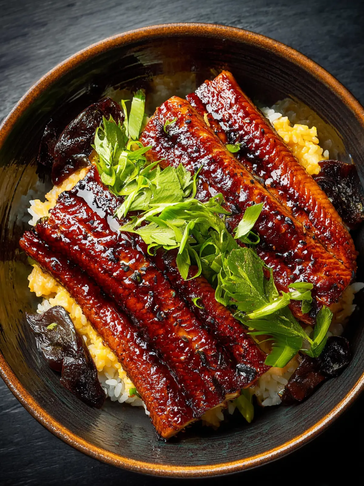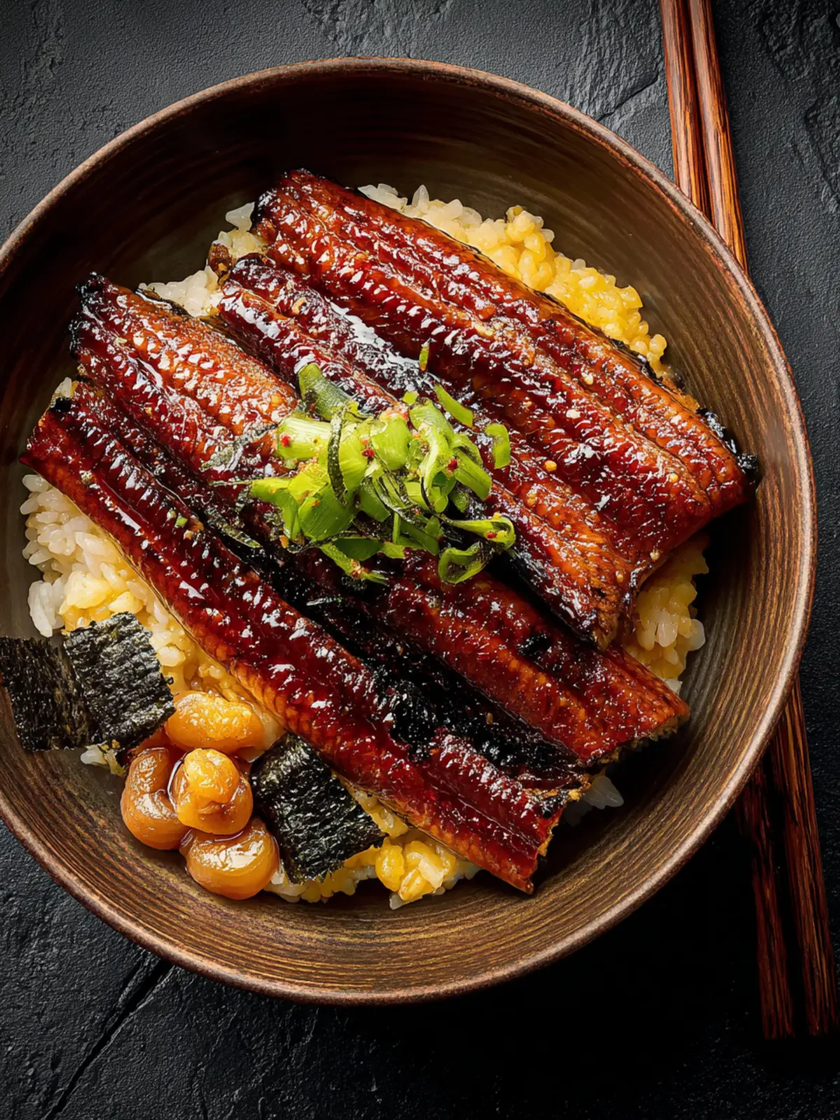 Finish off your unagi don with fresh sliced scallions and a sprinkle of sesame seeds. These toppings not only add flavor but also a lovely crunch and color, making your dish visually appealing.